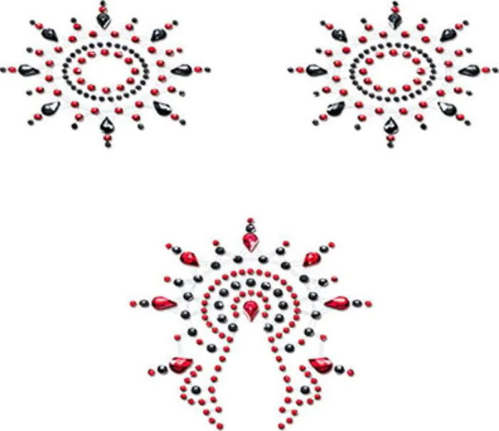 Set de 3 ornements corporels en cristaux pour poitrine et pubis, conçus pour être portés sous la lingerie ou à la vue. Confortables et faciles à retirer, ils ajoutent une touche raffinée à une soirée ou un strip-tease. Convient à qui veut un rendu brillant sans recourir à un bijou permanent; attention si tu as la peau très sensible aux colles.