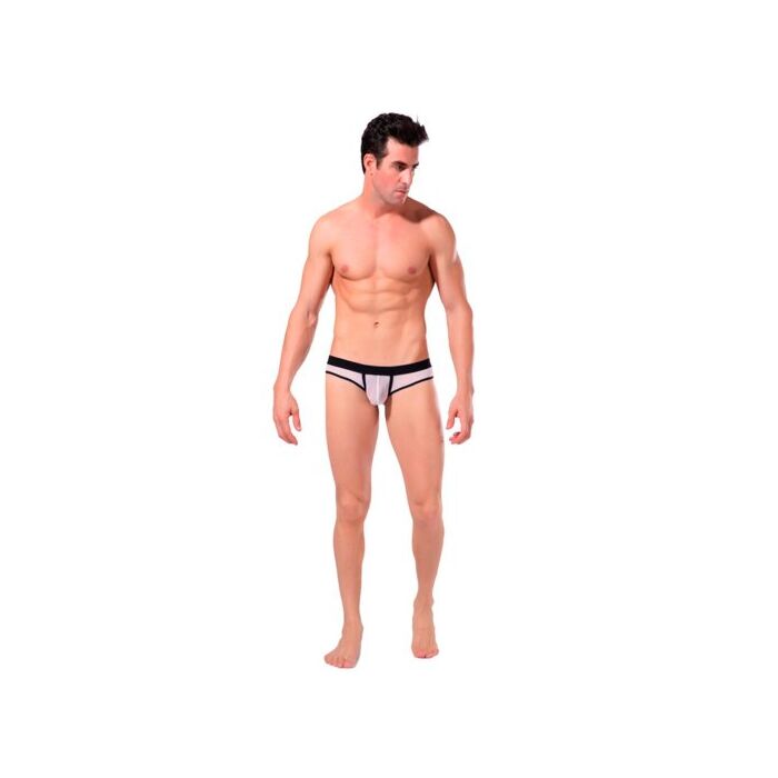 Tanga de color blanco combinado con negro. La cintura es ancha y elástica para acomodarse a tu cuerpo.