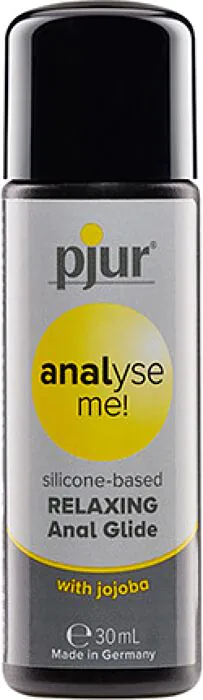 Voici le Pjur Analyse Me! Relaxing en 30 ml, un lubrifiant à base de silicone conçu spécifiquement pour la pénétration anale. Sa formule contient des extraits de jojoba qui aident à détendre la zone et une base silicone qui assure une glisse particulièrement prolongée — utile quand tu veux limiter les réapplications pendant l'acte. Le flacon de 30 ml est pensé pour l’essai ou pour compléter ta trousse de voyage.
