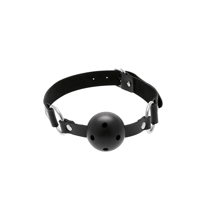 C'est un bâillon boule destiné aux amateurs de jeux de domination et soumission qui privilégient la respiration et le confort. La sphère en gomme souple offre une prise en bouche ferme sans rigidité excessive, et ses ouvertures permettent de respirer plus facilement qu'avec une boule pleine. Les anneaux métalliques relient la boule à une lanière en cuir, fermée par une boucle ajustable pour s'adapter à plusieurs tailles de tête.