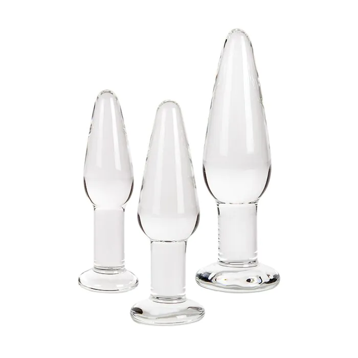 Pack de trois plugs en verre transparent, pensés pour une initiation progressive à la stimulation anale. La pointe conique facilite la pénétration, la base plate assure une prise sûre. Le verre permet de varier les sensations en jouant avec la température. Conviennent à qui cherche contrôle et finesse plutôt qu'élasticité ou flexibilité.