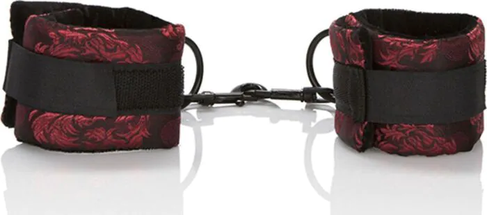 Je te présente les menottes Scandal de CALEXOTICS: un set de quatre bracelets ajustables en brocart, doublés d’un intérieur très doux et doté d’anneaux toriques pivotants. Ce qui distingue ce modèle, c’est l’association du tissu élégant et d’un double rembourrage qui protège la peau tout en offrant une bonne tenue grâce aux fermetures Velcro. C’est une option orientée confort et esthétique pour des jeux de retenue légers à modérés.