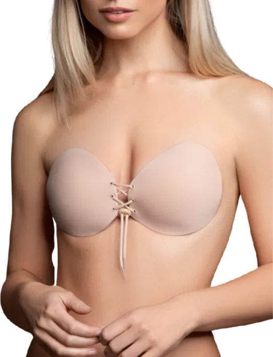 Le soutien-gorge adhésif Round Lace-it de Bye Bra offre un soutien optimal sans bretelles, recommandé pour les tenues dos nu. Son système de fermeture à nouer vous permet de personnaliser l'effet décolleté.
